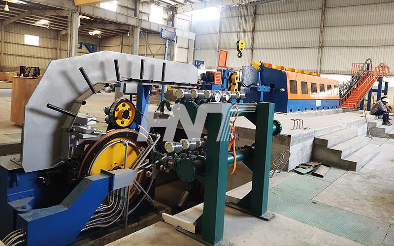 2. The production line is composed of the melting furnace, holding furnaces, four-wheel continuous casting machine, straightening machine, front traction, rolling shear machine, medium-frequency heating furnace, feeding machine, continuous mill machine, cooling system, take-up rod device, and electrical control system.
